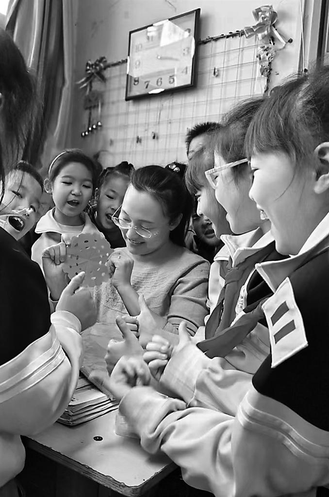 课间休息时,李清会和孩子们围坐在一起聊天猜谜,偶尔“显摆”一下新学的剪纸手艺,也会放下老师的身份虚心“学艺”,向孩子们学习下棋,尝试他们口中的新奇玩法。她还带着学生们体验翻绳、拍方宝等传统游戏,让孩子们感受传统游戏的乐趣。